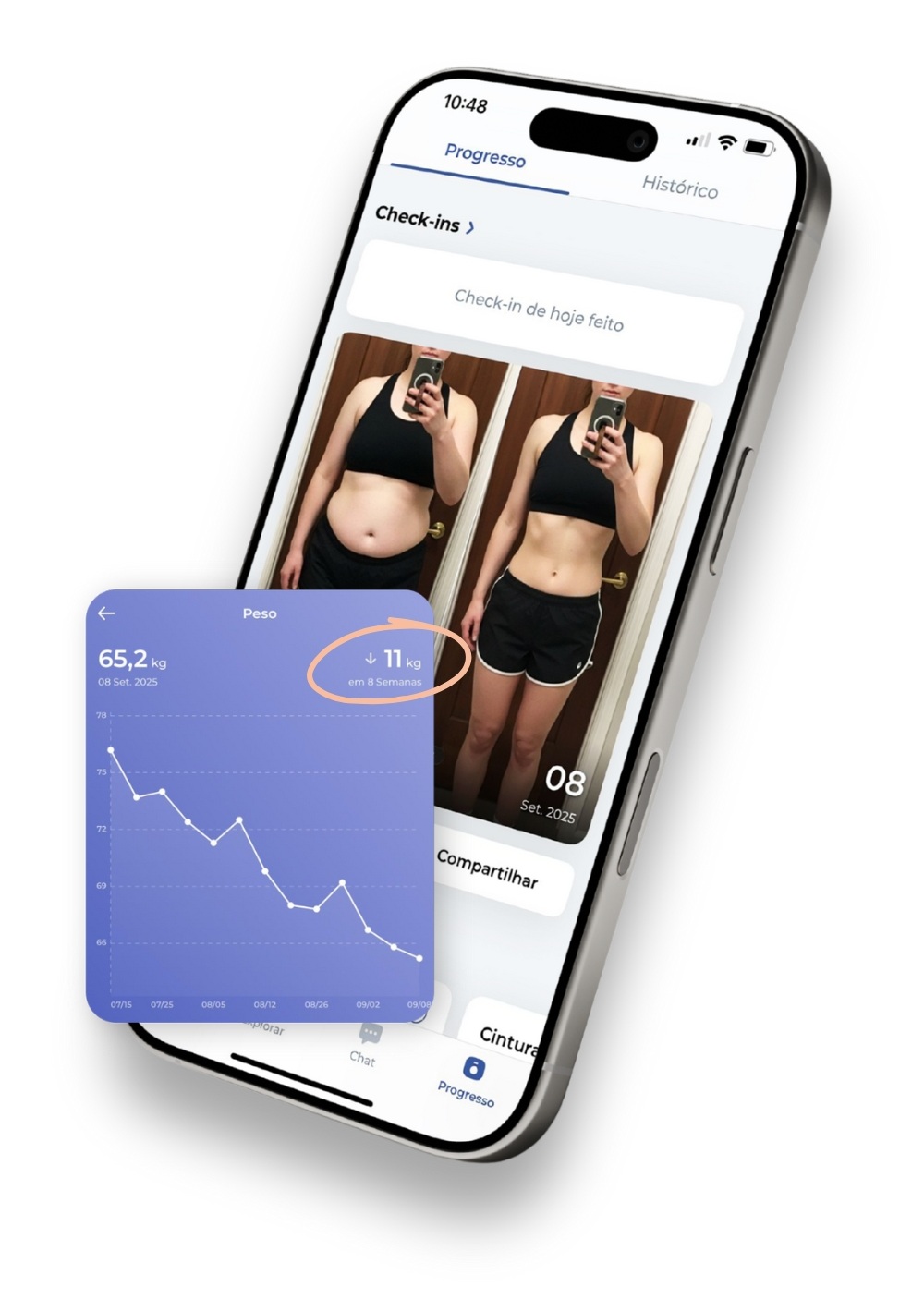 Dentro do app você pode registrar peso, medidas e fotos de progresso. O sistema gera gráficos claros para acompanhar sua evolução e manter sua motivação em alta.