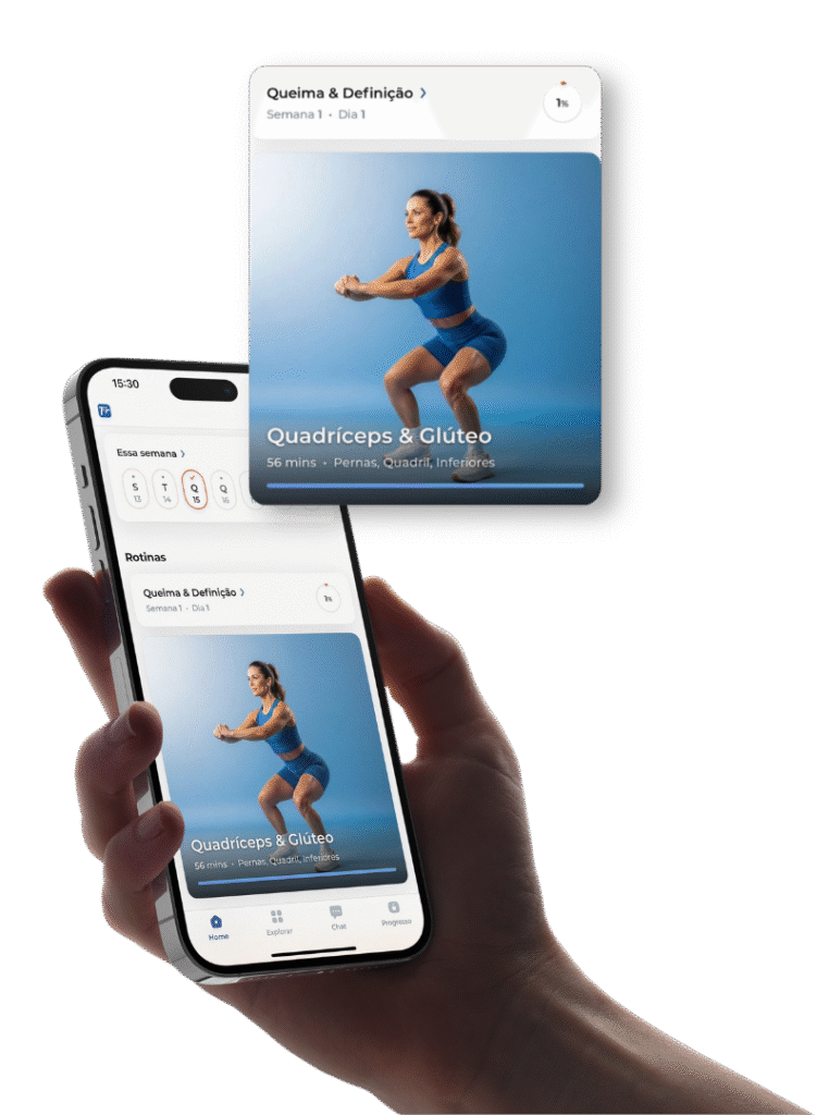 Após escolher seu plano e concluir o pagamento, você receberá um e-mail com as instruções de acesso. Basta baixar o Treine+ na App Store ou Google Play, criar sua senha, responder o quiz e começar.